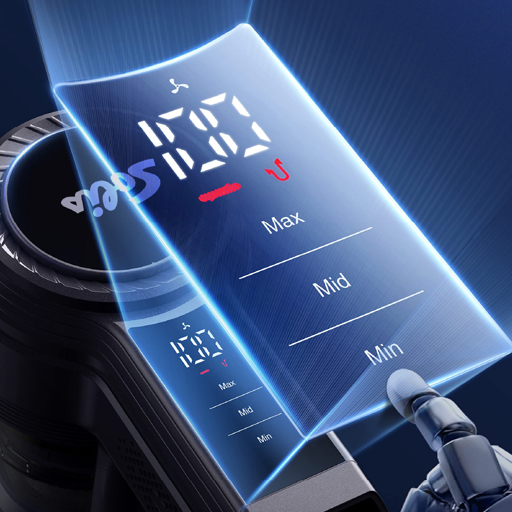 The display shows the charge status in % in real time, as well as a blockage of the brush and air duct.
