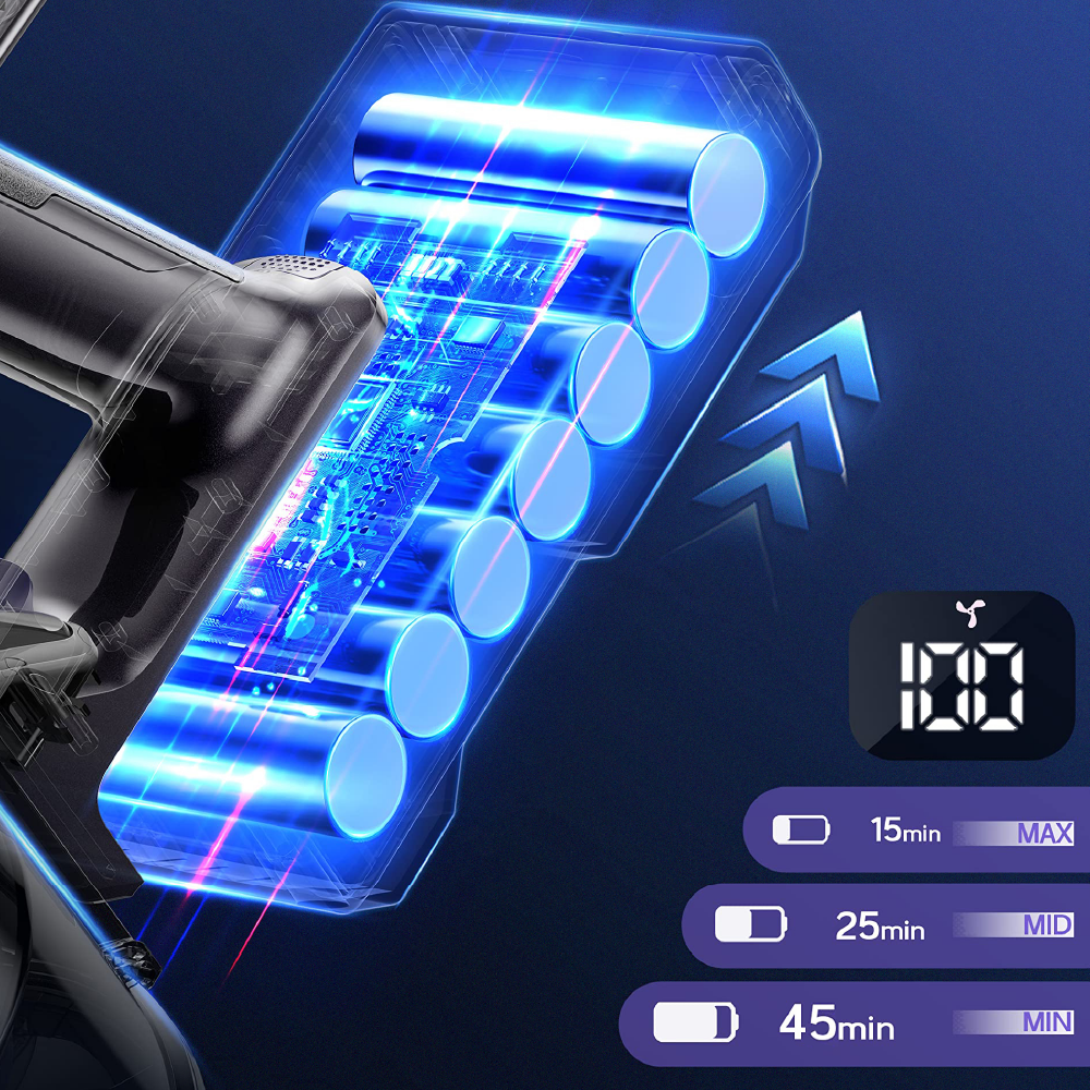 The display shows the charge status in % in real time, as well as a blockage of the brush and air duct.